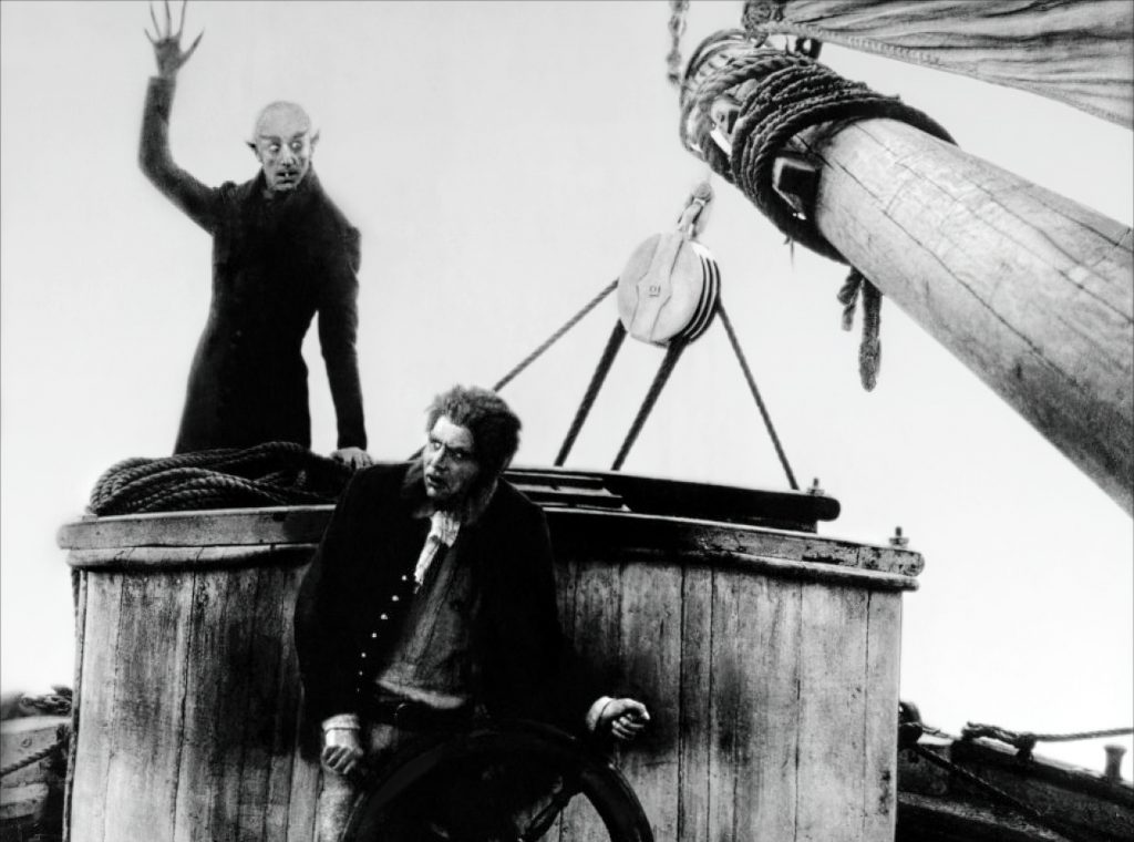 L’action est délocalisée de Londres vers une ville portuaire imaginaire, Wisborg, appartenant à l’aire hanséatique (région de Lübeck vraisemblablement). Dracula devient le comte Orlok ; Renfield, Knock (étrange parenté avec la future pièce de théâtre de Jules Romains !) ; Jonathan Harker, Thomas Hutter ; et sa fiancée Mina, Ellen. Ce que la grande histoire retiendra, c’est évidemment l’interprétation hallucinante du comte lugubre joué par un acteur venant du théâtre (écurie de Max Reinhardt), littéralement habité par le rôle, un certain Max Schreck, dont le patronyme signifie de surcroît « terreur », « peur » et « effroi ». C’est précisément ce que le spectateur ressent dès sa première apparition en sinistre cocher qui conduit le jeune clerc de notaire Hutter dans le fameux château maléfique, niché sur un piton rocheux, dans une sublime Transylvanie reconstituée en Slovaquie, dans la région de Zilina (il s’agit du château d’Orava). Schreck possède ce physique longiligne, osseux et angulaire, aux ongles acérés et à la mobilité raide, robotisée et spectrale. Dès la sortie du film, une étrange légende circule, sans doute pour des raisons marketing, visant à confondre l’acteur et sa créature. Selon la rumeur, Schreck serait un véritable serviteur des ténèbres, incapable de dormir dans un lit et se tenant systématiquement à l’écart de l’équipe de tournage ! Cela inspirera un autre cinéaste en l’an 2000, l’américain Elias Merhige, auteur d’un film étonnant et hélas peu connu, L’Ombre du vampire, qui met en scène un méconnaissable Willem Dafoe en interprète du vrai-faux Schreck-Orlok, lequel emporte finalement son mystère dans la tombe en 1936.