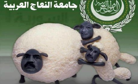 *Photo : Caricature syrienne représentant l’émir du Qatar et le secrétaire général de la Ligue arabe sous la bannière « Ligue des brebis arabes ».