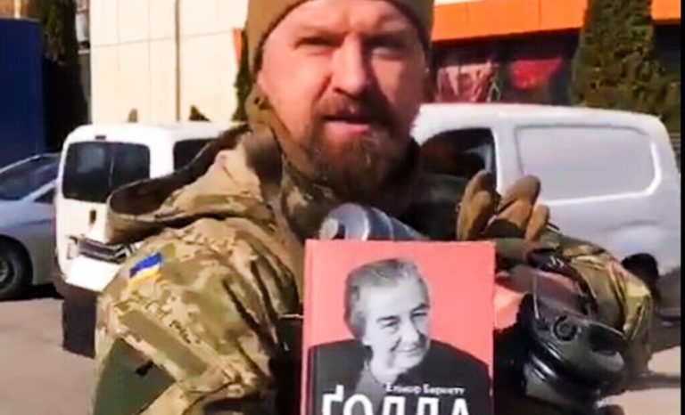 La photo a fait le tour du Web : on y voit un soldat ukrainien en uniforme, qui porte fièrement un livre à la couverture rouge, arborant la photo de Golda Meir. « Mon surnom est Zion, je ne suis pas juif, je suis ukrainien, patriote ukrainien, nationaliste ukrainien et sioniste, le livre de Golda Meïr ne me quitte pas même au combat » a déclaré Alexis, commandant d’une unité au Nord de Kiev. Cette photo a été prise par le journaliste israélien Ron Ben Yishai, et elle illustre un phénomène inattendu, qu’on pourrait décrire comme l’inspiration juive et israélienne de la résistance armée ukrainienne.