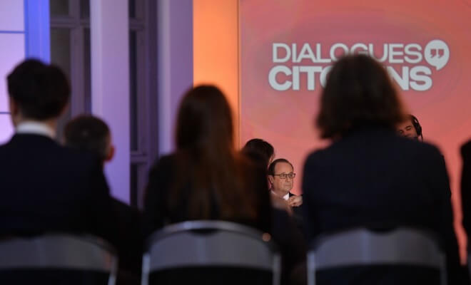Plus encore que le contenu des échanges – recadrage de Macron et Valls, candidature possible pour 2017 -, la forme de ce spectacle désolant en dit long sur notre culture médiatique et politique. Le dialogue direct avec les Français participe d’une lame de fond encouragée par la révolution numérique : la chute des intermédiaires. Plus besoin de passer par une agence de voyage pour acheter un billet d’avion quand on peut le faire directement par Internet, plus besoin de taxi professionnel quand un Smartphone permet la rencontre entre offre et demande de transport. Selon la même logique, à quoi servent les journalistes quand on peut interpeller directement nos dirigeants ? Autrement dit, Dialogues Citoyens est une sorte d’Uber du journalisme. Ce n’est pas nouveau : les années 2000 ont vu naître le discours sur le journalisme citoyen, les blogs qui allaient tout changer et les différents « leaks » de lanceurs d’alerte qui ont inauguré l’ubérisation de la dénonciation. Quand Edwy Plenel a lancé son journal en ligne, il l’a appelé « Mediapart », c’est-à-dire média participatif. Depuis, comme la démocratie directe, le journalisme citoyen a montré ses limites, l’idée qu’on pourrait se passer des professionnels de la politique et du journalisme s’étant révélé une chimère. Mais le mythe est tellement tenace que médias et politiques s’obstinent à écouter des « citoyens » aux interventions, souvent gênantes et maladroites, mises en scène avec paternalisme. Qui les a choisis et comment ? En quoi sont-ils représentatifs de quoi que ce soit, sinon de certains préjugés forgés et véhiculés par ces mêmes médias ?
