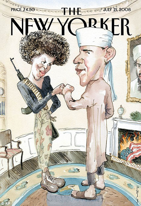 Vous, je sais pas, mais moi quand j’ai vu l’image, j’ai compris tout de suite que le journal dénonçait ce qu’il montrait : la caricature du couple Obama agitée dans des milieux d’extrême droite. Non que j’aurais un cervelet plus véloce que la moyenne. Grâce à un vieux truc qu’on appelle le contexte. Un cerveau humain raisonnablement agile peut sans doute enregistrer, en même temps que la signification immédiate d’un dessin, le fait que ce dessin n’est pas publié dans un journal d’extrême droite ni même bushiste mais dans un hebdomadaire qu’affectionne l’intelligentsia, et en déduire instantanément que le dessin n’est pas à prendre au premier degré.