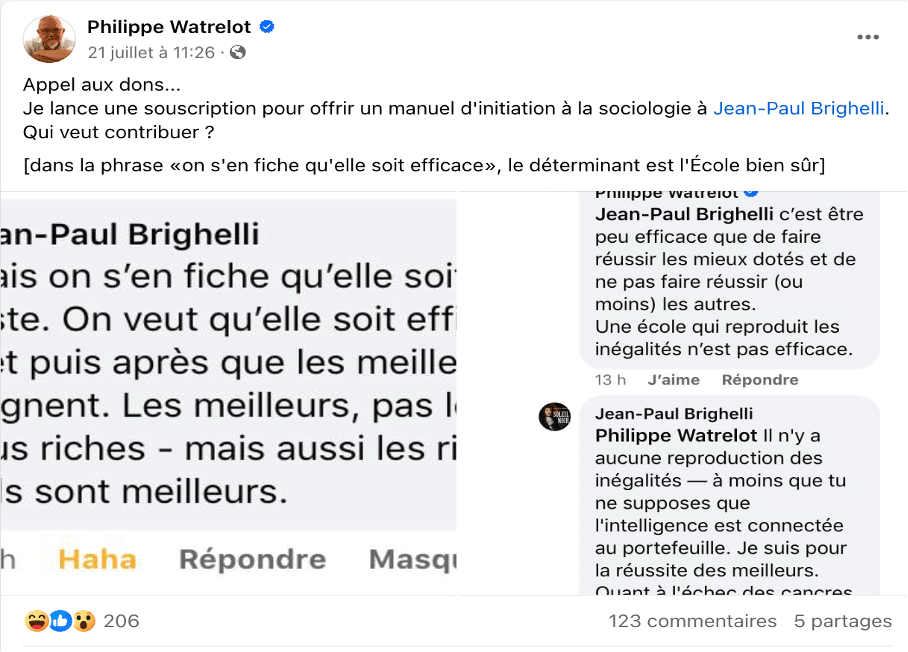 Je faisais ce constat il y a peu, en me colletant avec l’un de mes meilleurs amis / ennemis, Philippe Watrelot, ex-agrégé de SES, conseiller de Najat Vallaud-Belkacem pour laquelle il a écrit un rapport intitulé « Innover pour une École plus juste et plus efficace », et auteur, entre autres, de Je suis un pédagogiste (2021). Tout ce que j’aime. J’interviens de temps en temps sur sa page Facebook (et il a la politesse d’y accueillir mes éructations), et dernièrement, après une énième critique des sociologues de l’Educ-Nat, il a posté une page pleine d’humour :