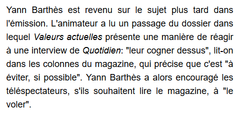 Ce ne sont pas des conseils: je dis seulement devant quelle « alternative » les gens sont placés par le concept même de l’émission. Soit on répond gentiment et on est ridiculisé, puisqu’ils nous interviewent pour nous ridiculiser. Soit on cherche à s’en sortir autrement. Et comme ils n’acceptent pas les refus, on est bien contraint de trouver d’autres solutions si l’on ne veut pas être une « victime consentante ». Et je dis, donc, qu’ils ne nous laissent pas d’autre échappatoire que la violence. La pirouette de Barthès est marrante, quand il dit que, puisque j’appelle à leur taper dessus, il va demander aux gens de « voler » le numéro de Valeurs Actuelles. Sauf que je n’ai pas demandé aux gens de leur taper dessus. J’ai dit que, considérant leurs méthodes agressives et humiliantes, il n’était pas étonnant que certaines personnes fassent le choix de réagir par la violence. That’s all folks ! D’ailleurs, soyez logiques : si « l’option 2 » était un « conseil », « l’option 1 » en serait un aussi. Or, je ne conseille à personne de répondre aux questions de Quotidien, pas plus que de leur taper dessus.