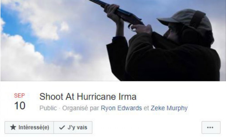 Avant le passage dévastateur d’Irma sur les côtes de Floride, certains habitants prirent leurs précautions, comme barricader leur maison ou faire des provisions d’eau potable. D’autres, encore plus pragmatiques, décidèrent de bouter hors de leur Etat ce dangereux intrus tel un vulgaire boat-people cubain en… lui tirant dessus ! Cette idée, émanant d’un jeune homme de 22 ans, n’aurait été qu’une blague imaginée « dans une combinaison de stress et d’ennui », selon ses dires. Seulement voilà, une bonne partie des 80 000 personnes qui s’inscrivirent sur « l’événement » Facebook prirent au sérieux la consigne suivante : « Montrons à Irma que nous tirons les premiers ! ». Et à chacun, dans la foulée, de s’exhiber arme au poing, en tenue militaire, au milieu de son arsenal de pétards, et de partager quelques avis d’experts, comme suggérer d’utiliser des lance-flammes, paraît-il plus efficaces pour disperser un ouragan, ou de viser les « points faibles » de l’adversaire, infographies à l’appui, et surtout pas l’œil du cyclone « d’où les balles peuvent revenir ».