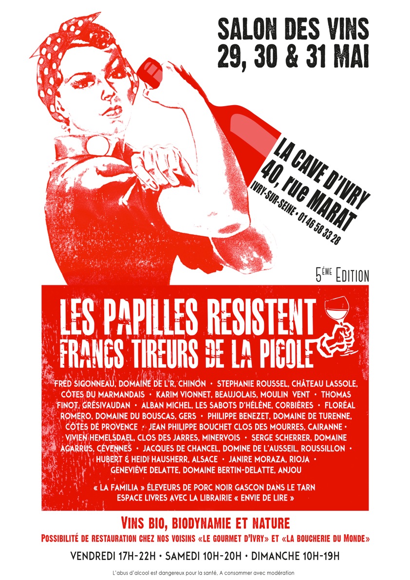 Il semble désormais que les FTP (Francs tireurs de la picole) tiennent solidement leurs positions du côté d’Ivry. Pour la cinquième année consécutive, dans le cadre du salon Les papilles résistent, le caviste Paco Mora va faire donner le canon (et donc inviter à en boire) contre les vins standardisés, parkérisés et saturés d’intrants qui donnent mal à la tête et feraient regretter de boire. L’ivresse est aimable et féconde, on le sait depuis longtemps du côté de Mora, à condition d’éviter le sac à malices perverses des affreux qui font pisser la vigne et veulent faire passer des filles coquines pour des grandes dames, en les maquillant comme des voitures volées à coup de levures exogènes, de tanins artificiels, d’exhausteurs de goût et autres sulfites.