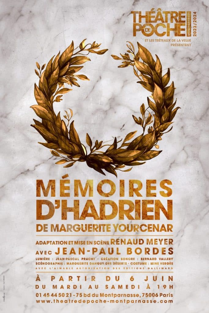 Jusqu’au 16 mai, du mardi au samedi à 19 heures, Jean-Paul Bordes est un Hadrien de chair et d’esprit au Théâtre de Poche Montparnasse dans une mise en scène de Renaud Meyer. Marguerite Yourcenar (1903-1987) a trouvé dans cet acteur de haute intensité l’incarnation et la sublimation de son empereur romain. Une interprétation magistrale dans l’intimité d’une salle à l’unisson…