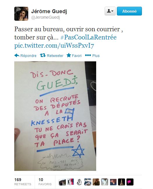 Jérôme Guedj, député PS et président du Conseil général de l’Essonne, a fait le buzz de cette prérentrée politique en twittant le fac-similé d’un courrier antisémite à lui adressé :