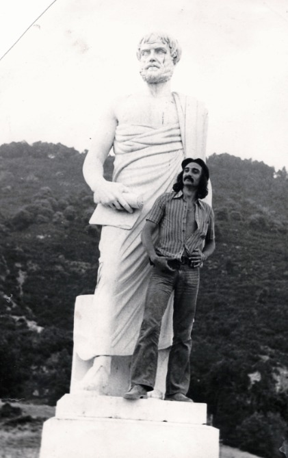 Si ! C’est moi, en 1974 — quelques jours après les faits relatés ci-dessous. À l’ombre de la statue d’Aristote. Le copain qui l’a prise a judicieusement griffonné, au dos : « Quel minus ! »