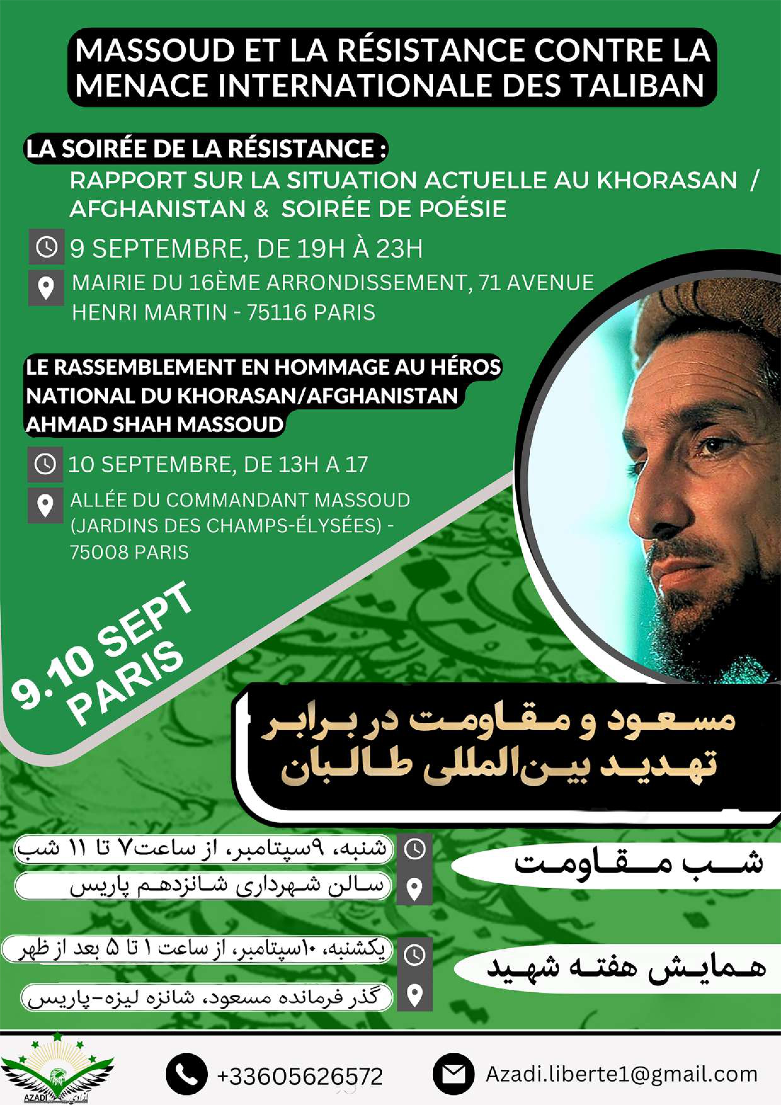 Le 9 septembre 2023 marque le 22ème anniversaire de la mort du légendaire Commandant Massoud, assassiné par des terroristes islamistes d’Al Qaïda. Il avait lutté héroïquement pour la liberté de son pays, l’Afghanistan, d’abord contre l’invasion soviétique, ensuite contre la barbarie obscurantiste des Talibans. Par cette commémoration publique, ce dimanche 10 septembre, sur les Champs-Elysées de Paris, nous rendons hommage à cet homme de paix, féru de culture démocratique.