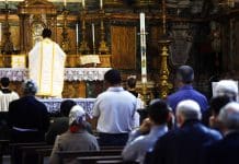 En fait non, arrivé au feu rouge, je tombe sur une procession. Des scouts, des drapeaux, des croix, des prêtres, des étendards, des vierges et des saints, des chants et des prières, et même, porté par quatre jeunes gaillards, sur une sorte de « brancard » (qu’on me pardonne, je manque de vocabulaire catholique), saint Michel, sa lance à la main et un pied sur le dragon.