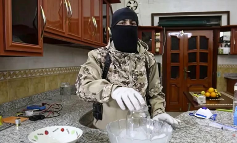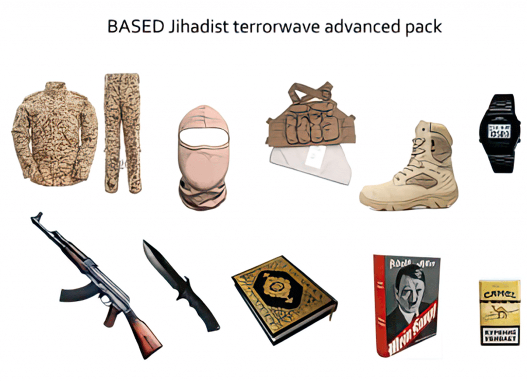 D’autres mèmes suprémacistes mélangent des symboles néonazis et l’imagerie islamiste. En juin 2021, Pax Aryana a disséminé l’image stylisée d’un combattant djihadiste qui porte un masque de tête de mort et un bandana néonazi (Fig. 2). D’un doigt il désigne le ciel, en un geste qui symbolise le tawhid, l’unité de Dieu selon la doctrine musulmane. Le portrait est décoré de « Wolfsangels » ou « hameçons de loup », une sorte de rune stylisée affectionnée par l’extrême droite. Un nœud coulant pendille sinistrement. Des chaînes néonazies ont également fait circuler une image étiquetée « BASED Jihadist terror wave advanced pack », figurant l’équipement du combattant et terroriste dans le style djihadiste (Fig. 3). Outre un treillis, une arme automatique et un paquet de clopes, on y voit un exemplaire du Coran et un autre de Mein Kampf. Le mot « based » est un terme d’approbation utilisé par les deux partis, signifiant peu ou prou le contraire de « woke ». Autre exemple, en mai 2019, le groupuscule européen Feuerkrieg Division a posté la capture d’écran d’une vidéo propagée par l’État islamique expliquant comment fabriquer une bombe artisanale avec de la peroxyde d’acétone (Fig. 4), explosif utilisé dans l’attentat islamiste de Manchester en 2017. « C’est plus facile que vous ne pensez », indique la légende. D’autres mèmes glorifient Oussama Ben Laden ou proclament : « Ouvre ton cœur à la terreur » et « Nous sommes pour toutes les sortes de terrorisme ». Toute cette rhétorique et cette esthétique, communes aux suprémacistes et aux salafistes djihadistes, se réduisent à un pur éloge de la violence.