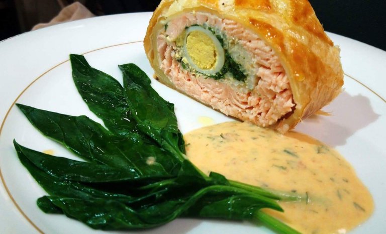 À Menton, le chef Jérôme Rigaud (né en 1975) a créé l’an dernier l’un des meilleurs bistrots de la Côte d’Azur : JR Bistronomie. Ce brillant cuisinier, formé par Joël Robuchon et Michel Troigros, y propose des plats russes traditionnels qu’il prépare avec beaucoup de soin et d’élégance, comme le bortsch, le bœuf Stroganoff et un koulibiac d’anthologie qu’il faut déguster avec un vin blanc sec et intense du Bellet, le vignoble de Nice tout proche. Le koulibiac, que les Français d’origine russe mettent un point d’honneur à fabriquer chaque année lors des grandes occasions, est un délicieux pâté chaud, fait avec une pâte briochée, farcie au saumon frais, aux champignons, au kacha (gruau de sarrasin), à l’oignon, aux œufs durs, à l’aneth, le tout parfumé au bouillon de légumes, et nourri au beurre fondu, avec une pointe de citron.