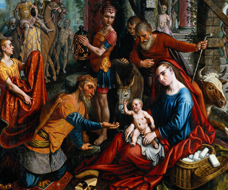 En ces temps de Noël, il est bon de nous replonger dans la peinture religieuse. Cette œuvre de l’Espagnol Bernardino Lapuerta représente l’adoration de l’Enfant Jésus par les rois mages. A eux trois, ils formèrent la première Star Ac’ de l’histoire : c’est en suivant l’étoile qu’ils se rendirent à Bethleem, honorèrent de moults salamalecs le nouveau-né avant d’être reconduits à la frontière par Simplicius Auvergnatus. La tradition rapporte qu’ils offrirent de la myrrhe, de l’or et de l’encens au petit garçon qui était, dit-on, issu d’une excellente famille du côté de sa mère (ce que le peintre souligne en la revêtant d’un élégant drapé pourpre de chez Christianos Diorus). Quant au père de l’enfant, s’il ne figure pas sur ce tableau c’est qu’il était très économe de ses apparitions.