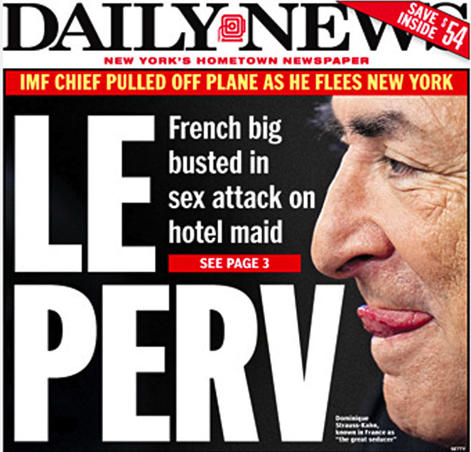On soulignera que le journal qui a publié ce « scoop », est un tabloïd trash de la plus belle eau, auprès duquel notre France-Soir fait figure d’édition quotidienne du Monde Diplo. Son traitement de l’affaire est plutôt tendancieux , disons presque autant que celui de Laurence Haïm, la correspondante permanente de Canal+ et iTélé aux USA, mais pas vraiment dans le même sens . Alors que Laurence s’étranglait de rage après le premier maintien en détention de DSK ou pleurait presque d’émotion après l’annonce finale de sa libération sous caution, le Daily News lui, multipliait les Unes vengeresses comme celle-ci :