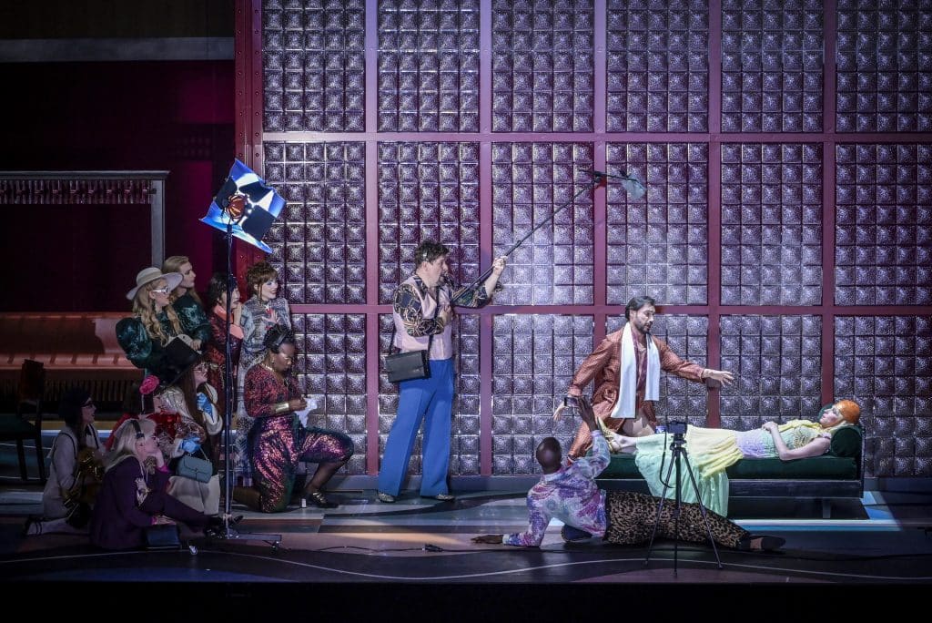 Comme pour difracter l’illusion à l’infini, d’un bout à l’autre des trois actes la scénographie emboîtera les espaces gigognes dans une orgie de mises en miroir : s’y agrègent projections de films muets noir et blanc ou colorisés, captations vidéos, selfies, retournement de la perspective avec ce théâtre dans le théâtre incrusté dans le plateau, pour faire des protagonistes eux-mêmes les figurants d’un spectacle, la scène se refermant soudain d’un immense rideau lustré de couleur vert gazon… Les costumes eux-mêmes, bariolés à outrance, mascarade trash à la puissance deux, participent de cette surenchère trop lisiblement intentionnelle. Si la veine burlesque, parodique, de cette « comédie en musique op 59 » s’en trouve soulignée, l’opéra y perd un peu de la dimension lyrique qui culmine dans les épanchements du sublime trio final.