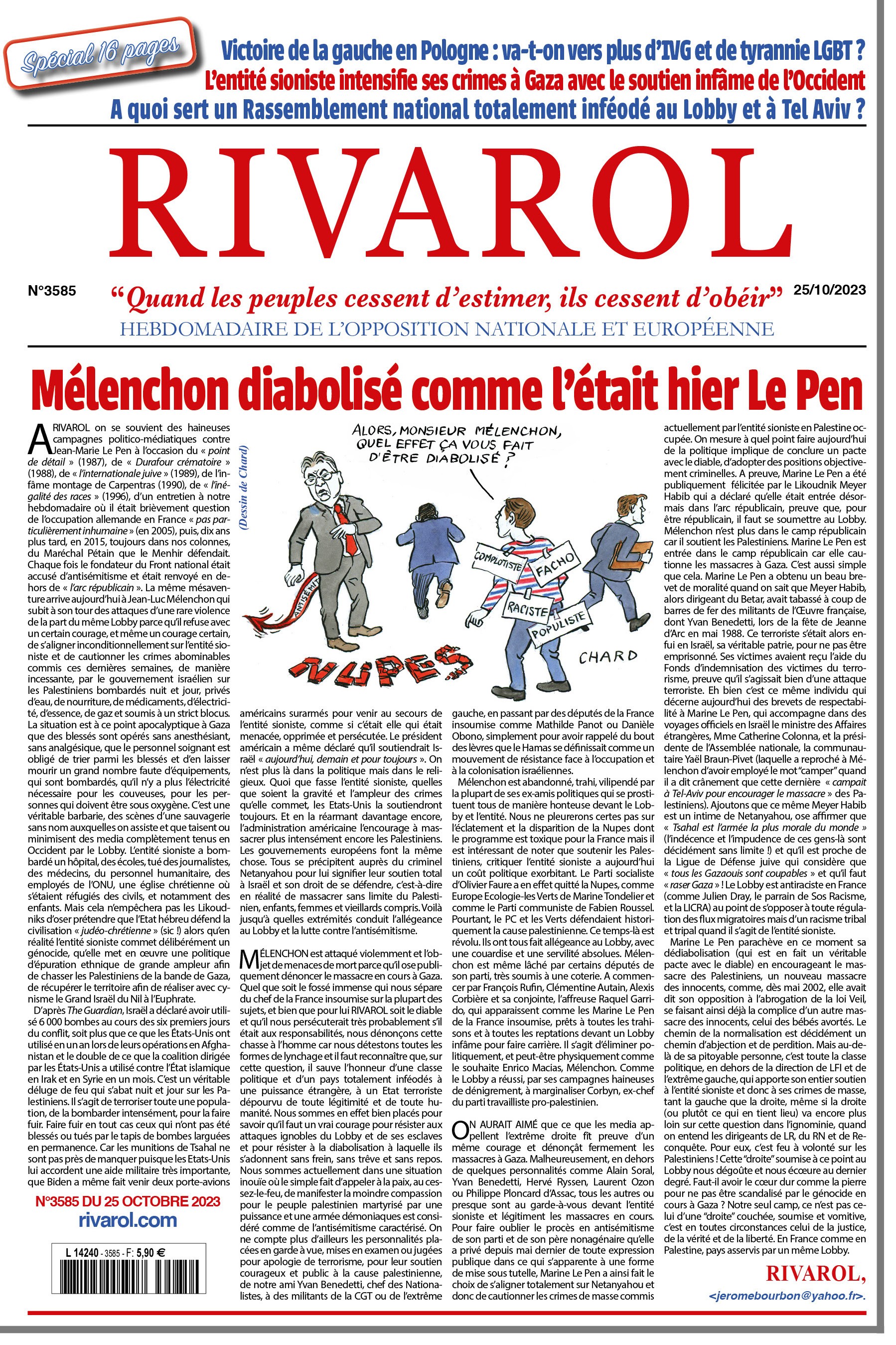 Dans la foulée de cet appel paru dans ses colonnes, et après avoir déjà consacré de nombreux articles à la « cause palestinienne », le quotidien communiste a publié, jeudi 26 octobre, une Une bien débectante. Sur un fond sombre – un ciel noir, orageux dans lequel planent de menaçants avions ou drones – Yaël Braun-Pivet, Meyer Habib, Manuel Valls, Eric Ciotti et Jordan Bardella sont représentés entourés de ruines d’immeubles détruits par les bombes. Le titre, en gros : « Les inconditionnels de Netanyahou ». Le sous-titre : « Des personnalités françaises font bloc derrière Tel-Aviv en justifiant tout, y compris les crimes de guerre à Gaza au nom du “droit à se défendre”. » Sur CNews, dans l’émission Punchline, Éric Naulleau a dit son écœurement à la vue de cette Une de L’Humanité faisant « penser à Rivarol, journal d’extrême droite négationniste et antisémite » – le même Rivarol qui, dernièrement, a salué le « courage » d’un Jean-Luc Mélenchon refusant de « s’aligner inconditionnellement sur l’entité sioniste » – et Céline Pina a souligné à juste titre l’hypocrisie d’un parti communiste disant rompre avec Mélenchon tout en s’appropriant la même imagerie idéologique anti-israélienne frisant parfois l’antisémitisme.