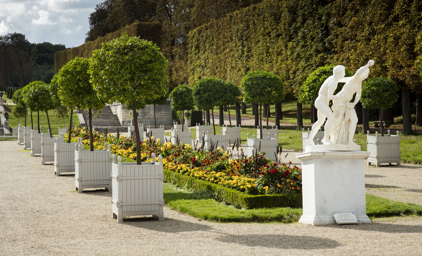 Si la splendeur retrouvée de Saint-Cloud n’est pas pour demain, le public peut déjà admirer la première étape de la restauration des jardins du château de Maisons-Laffitte, près de Paris. Ce chef-d’œuvre de Mansart, « une des plus belles choses que nous ayons en France », disait Charles Perrault en 1696, a malheureusement perdu au fil du temps l’ampleur de son parc – qui ne représente plus que 1 % de sa superficie d’origine ! Drastiquement diminué par l’urbanisation au xixe siècle, loti et remanié dans la seconde moitié du xxe, amputé par des voies de circulation, le terrain n’offre plus les perspectives et les axes de promenade qui faisaient le ravissement des visiteurs. Mais le domaine a conservé quelques beaux restes – telles ses grottes ou salles de fraîcheur – mis en valeur par l’architecte en chef des Monuments historiques, Stefan Manciulescu, et le paysagiste Louis Benech. Les premières études ont été lancées en 2010, le chantier s’est déroulé de juillet 2020 à juillet 2021, sera totalement achevé en 2025 et aura coûté 4 millions d’euros. Le travail du paysagiste a notamment consisté à réduire les surfaces de gravier pour augmenter celles de verdure afin d’accentuer l’impression d’« écrin végétal ». Il a densifié les plantations déjà existantes avec une centaine de nouveaux arbres et joué sur leurs essences pour, qu’une fois grands, ils ne brouillent pas les alignements redessinés ni n’occultent les façades du château. Les deux parterres centraux ont été allongés et traités en « prairie fleurie » et, ici encore, le grand bassin a été rénové et ses 39 jets remis en état de marche. Parce qu’un jardin raconte une histoire, Louis Benech aimerait « que cette “prairie” qui entoure le bassin soit suffisamment agréable pour que les visiteurs aillent jusqu’au bout pour avoir une jolie lecture sur le château. » Son objectif est atteint : lorsque l’on descend l’escalier de la terrasse sud, nos pas nous mènent naturellement au bout du parc.