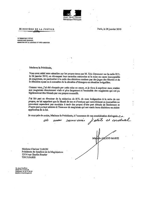 La lettre de Michèle Alliot-Marie au Syndicat de la Magistrature