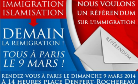 Si la récente votation suisse au sujet de l’immigration a servi d’inspiration aux initiateurs de la manifestation parisienne, la restauration des quotas d’immigrés pour laquelle ont opté les Suisses ne leurs semble pas du tout satisfaisante. Présent et acclamé, Renaud Camus, dont la théorie du « grand remplacement » du peuple français « de souche » par les peuples venus d’ailleurs, notamment du Maghreb et d’Afrique, continue à nourrir les esprits des « Identitaires », affermit sa position. Avec l’éloquence qui lui est propre, l’écrivain et supporteur assumé de Marine Le Pen lors de la présidentielle de 2012, déclare : « Je m’oppose à l’immigration choisie et à l’immigration tout court, sans être pour autant un islamophobe. Il ne me plairait pas non plus, si je devais devenir animiste ou bouddhiste ». A la question de savoir comment régler le problème des immigrés, clandestins ou pas, déjà présent sur le sol français, Renaud Camus rétorque sur le ton d’une évidence : « Qu’ils rentrent chez eux ! ». Reste à savoir quels arguments ingénieux il faudrait avancer pour convaincre des gens qui ont risqué leur vie et se sont endettés au-delà du raisonnable pour venir en France, de rentrer « chez eux » et de préférence en payant de leur poche leur billet d’avion de retour.