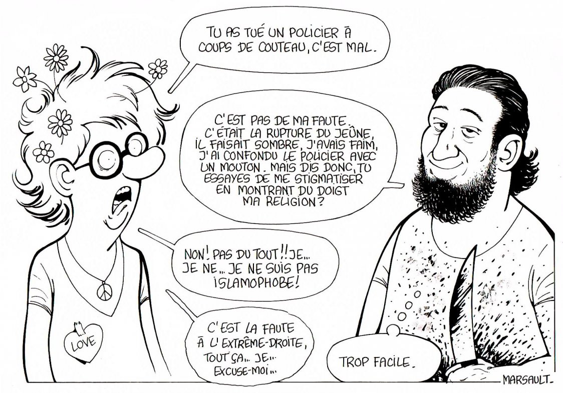 En 2015, le voilà donc installé chez Facebook, où l’ardeur avec laquelle il s’adonne au massacre des imbéciles lui attire des oppositions acharnées. Une campagne s’organise : on proclame sa griffe attentatoire à la dignité des femmes, puis on met au jour ses prétendues intentions racistes. On fait valoir que quelques-uns de ses dessins ont paru sur le site d’Alain Soral, Égalité et réconciliation, ce qui est vrai, mais on omet de préciser qu’ils ont été « partagés », c’est-à-dire empruntés, sans son autorisation. On fabrique une personnalité trouble, fascistoïde, dangereuse, alors que Marsault n’a même jamais été convoqué devant un tribunal. Un dessin, en particulier, lui a valu les foudres des nouvelles dames patronnesses :