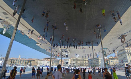 Si Paris est la Ville-Lumière, Marseille pourrait être la « Ville-Ombrière ». Il ne faut jamais oublier qu’à Marseille, c’est l’ombre qui est recherchée. « L’Ombrière » : c’est le nom du gigantesque miroir horizontal qui protège les badauds du soleil sur l’esplanade du Vieux-Port. En passant dessous, il suffit de lever le nez pour se voir à l’envers, comme si l’on marchait au plafond. J’ai rarement été séduit par un aménagement urbain de ce type, mais ici, je dois me rendre à l’évidence : l’idée est excellente et la réalisation parfaite. Non seulement cette construction ne gâche en rien le panorama de la ville, par exemple lorsqu’on la regagne en bateau des îles du Frioul, mais en plus elle se révèle utile à peu près toute l’année. En tant que Parisien en goguette, ce n’est pas ma seule découverte étonnante dans la plus grande ville de province française, qui semble être tout entière un miroir inversé de la capitale.
