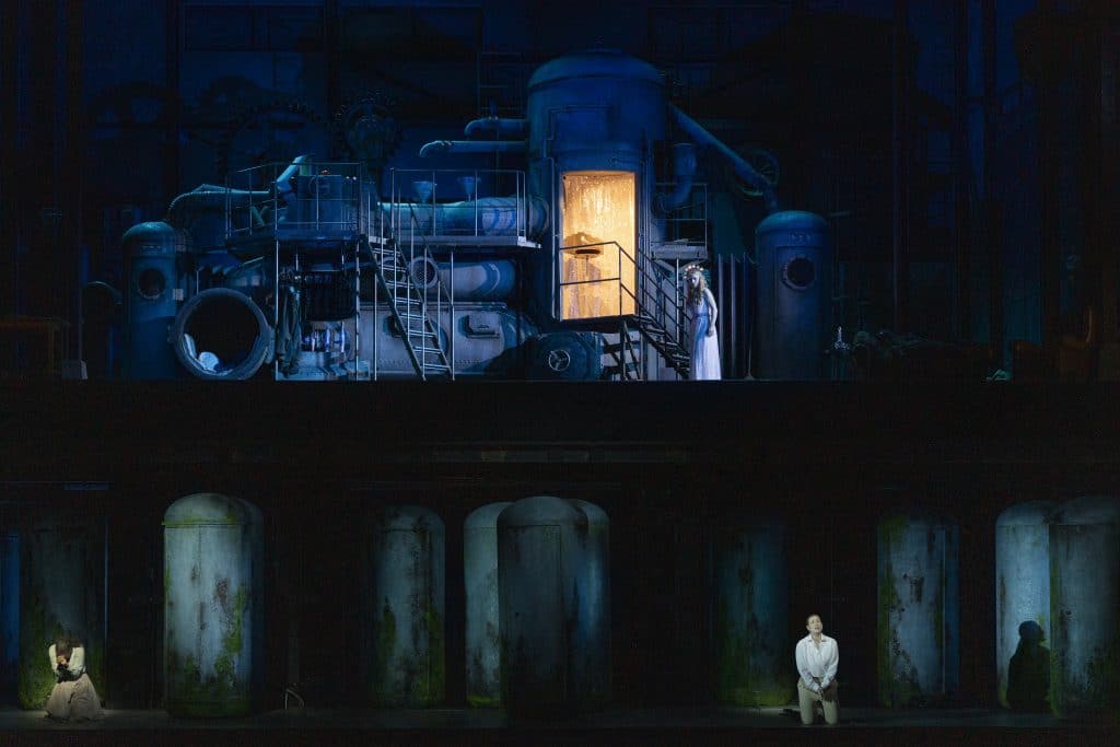 L’Opéra Bastille reprend donc, pour sept représentations encore, une production millésimée 2022, dans une mise en scène de Marianne Clément (costumes et décors signés Julia Hansen) qui renvoie à l’âge industriel et à ses usines, à ses filatures aux rouages compliqués, aux architectures de fer et aux resplendissantes verrières arborées de palmiers, dans l’âge d’or des expositions universelles. Mais aussi à la naissance du cinéma et aux fantasmagories de Méliès. La transposition du conte dans l’époque de la fée-électricité, en raccord avec la date de création de l’opéra (1899), fonctionne très bien sur le plan plastique. Sous la plume du librettiste Henri Cain, Cendrillon n’a plus rien d’un conte pour enfants : Madame de La Haltière, génitrice de Lucette (le prénom de Cendrillon) y figure une marâtre bourgeoise, antipathique mère-maquerelle tenaillée par une unique obsession : ravir en faveur de ses filles, Noémie et Dorothée, le parti le plus lucratif.
