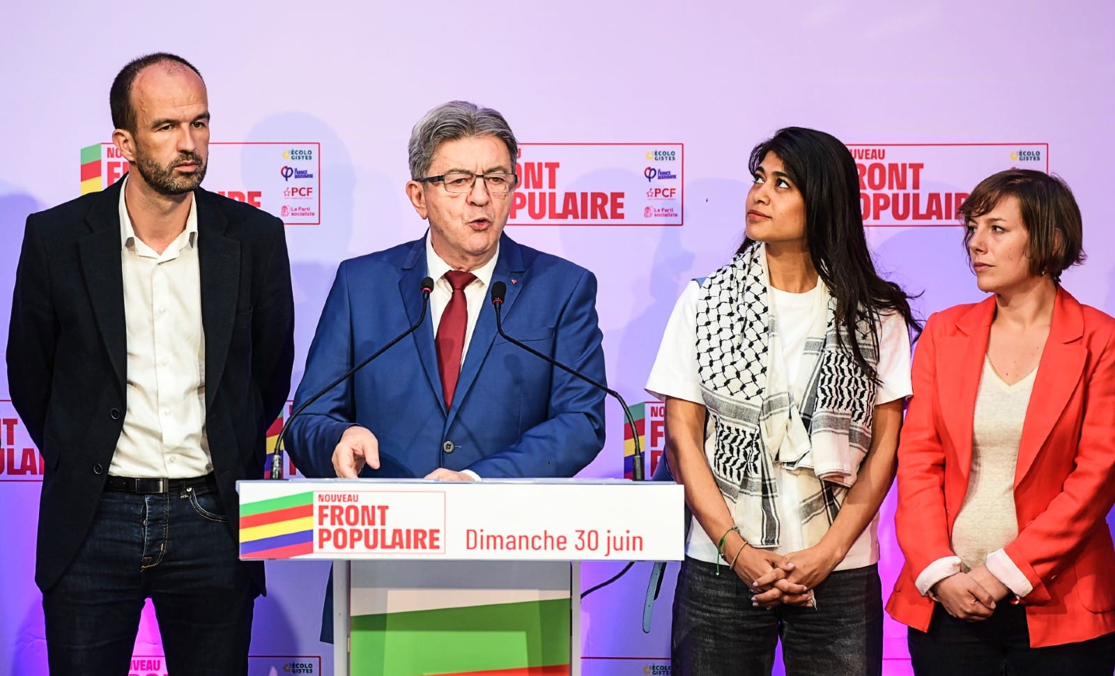 Hier soir, peu après 20 heures, le leader du Nouveau Front populaire Jean-Luc Mélenchon a appelé au retrait de tous les candidats de gauche arrivés en 3e position, aux côtés d’une Rima Hassan arborant un provocant keffieh palestinien. Il s’est ensuite rendu place de la République, pour haranguer la foule de ses soutiens qui occupait les lieux.