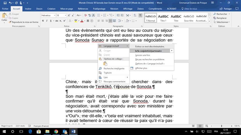 Bref, rien de très folichon, mais au moins me voilà en phase avec mon époque. A un point que je ne soupçonnais d’ailleurs pas. En effet, quelle ne fut pas ma surprise en relisant un texte que je comptais inclure dans une revue spécialisée dont j’ai la charge, écrit par un vénérable homme de lettres écrivant un français délicieux et légèrement suranné. Parmi les multiples façons de souligner les mots ou expressions qu’il juge fautifs, mon logiciel vient d’en inventer une nouvelle. Celle qui, sous la rubrique « langage inclusif », cherche des brides de « dénigrement » et de « discrimination » jusque dans les recoins les plus improbables de ma vie numérique et néanmoins quotidienne. Voilà la prose de mon admirable professeur soupçonnée d’être « dénigrante pour les femmes » lorsqu’il écrit « tous les députés » à propos de la Diète japonaise des années 1970. Et voilà d’ailleurs mon logiciel qui recommence au moment où je reproduis ceci. Il me propose de remplacer cette criminelle expression, sans doute symptomatique de la « culture du viol » qui sévit ici comme au Japon par « toutes les députées et tous les députés », au mépris manifeste d’un éventuel député non-genré qui aurait subrepticement occupé un siège à la Diète.