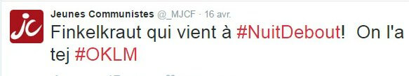 Blague à part, lorsqu’elle ne stigmatise pas sa présumée camarade de lutte féministe Elisabeth Badinter pour crime d’islamophobie, Caroline de Haas va à République où elle rencontre « de la bienveillance, beaucoup » et même une « envie de faire » intransitive inaccessible au cerveau borné du « réaco-philosophe ». Pour ricaner de l’abolition du capitalisme et de l’extension infinie des droits votée à l’unanimité, il faut avoir la morgue des anciens révolutionnaires. Ainsi, le tweet des Jeunes communistes consécutif à l’expulsion de Finkielkraut (voir ci-dessous) est-il une merveille de style djeune, rendant ici hommage au rappeur bling-bling Booba (auquel on doit l’expression « Okalm »), là au parler verlan de Pierre Laurent.
