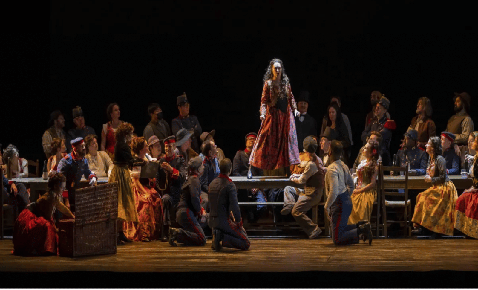 Mis en scène en 2011 par Jean-Michel Auvray, cette production, qui en est aujourd’hui à sa troisième reprise, date du mandat de Nicolas Joël, lequel, à la tête de l’Opéra de Paris, infléchissait le choix de ses régisseurs dans le sens d’une esthétique volontiers teintée de littéralité et de classicisme – d’aucuns diraient académique, voire « ringarde». N’empêche. Plus de dix ans après, et quoiqu’en aient jugé alors certains critiques, cette scénographie, assurément, « tient la route ». L’idée maîtresse en est d’avoir transposé l’intrigue dans l’époque même de la composition de La force du destin et de restituer ainsi le contexte politique et social dans lequel s’inscrit une œuvre qui doit beaucoup de son inspiration à la littérature romantique, et tout particulièrement à Schiller. Le réalisme épuré des décors d’Alain Chambon n’est pas sans résonner de cet « air du temps » élégamment allusif dont les vignettes parsèment les séquences, tandis que l’imposante et lustrée statue de cire d’un christ-martyre de dos, encordé, sa nudité vêtue d’un pagne emplit le plateau tel le leitmotiv irrécusable du fatum.