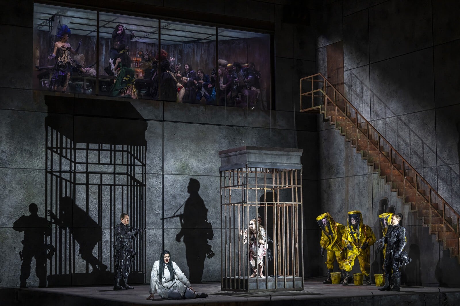 En 2024, il n’est plus une seule scénographie qui sacrifie de façon littérale à l’orientalisme clinquant dont la « danse des sept voiles » devant le Tétrarque hypnotisé constitue le plus célébrissime morceau de bravoure. Certes, il en faut beaucoup aujourd’hui pour choquer le public, habitué qu’il est aux transpositions débridées. Mais Lydia Steier a tout de même réussi à remuer les tripes des plus aguerris : le roi Hérode (excellent ténor allemand Gerhard Siegel) a la silhouette d’un Ubu en résille, ventripotent et libidineux, comme réchappé d’un cirque tzigane ou fellinien ; Hérodiade, son épouse (l’irremplaçable mezzo-soprano moscovite Ekaterina Gubanova), dépoitraillée, exhibe d’imposantes mamelles aux tétons percés de pierreries, érotomane livrée de bout en bout à la lubricité auprès de son obéissante soldatesque ; à l’étage fornique une Cour de drag-queens, de sado-maso et de gothiques en lycra, s’adonnant derrière leur baie vitrée à une interminable orgie dont les esclaves sexuels, une fois consommés, sont transportés nus au bas de l’escalier, dans des linceuls de toile blanche, pour être aussitôt jetés à l’égout par des gardes patibulaires, Famas en bandoulière, harnachés comme des CRS en tenue de combat, ou encore par ces employés en étanches combinaisons jaunes, façon liquidateurs de Tchernobyl…