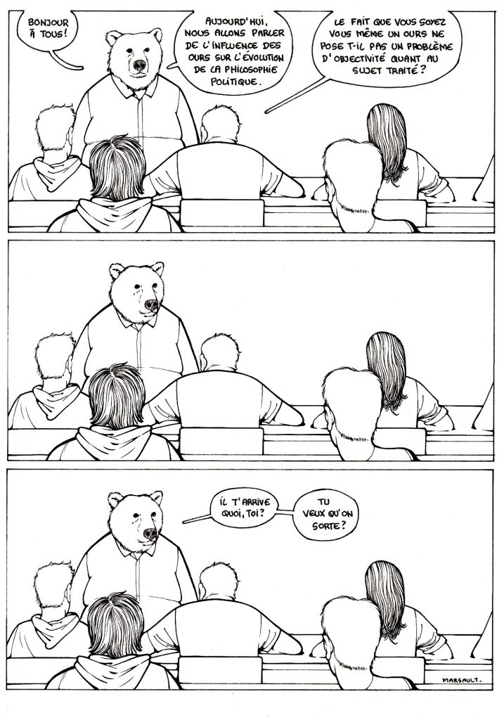 La population ursine du New Hampshire, longtemps en déclin sous l’effet de la chasse, commence à grandir dans les années 1960 et 1970 grâce à l’influence des environnementalistes. Pourtant, l’État, qui a une aversion pour les impôts, ne cherche pas du tout à maîtriser la situation. En 2007, il y a deux fois plus d’humains qu’en 1970 et six fois plus d’ours. En revanche, il y a 34 % moins de personnel pour gérer la faune sauvage. Le problème des ours est pire à Grafton, non seulement parce que la ville est encore plus sujette à la phobie administrative, mais aussi parce que les individualistes résidant dans les bois attirent encore plus d’ours, qui trouvent leur bonheur dans les poubelles des hommes. Plus grave encore, l’animal du xxie siècle n’est plus le même : un régime alimentaire très calorique à base de déchets humains a créé un ours plus excité, moins enclin à hiberner, plus audacieux, plus futé et plus gros. Les razzias des ursidés se multiplient sur les décharges, les poulaillers et jusque dans les cuisines des citoyens. Ces incursions s’intensifient à partir d’une grande sécheresse en 2012 et on assiste à des attaques sur des humains. Une vieille originale menant une vie solitaire n’a la vie sauve que grâce à son lama domestiqué qui chasse l’agresseur à coups de sabot. La pagaille que sèment les ours cristallise les défauts du libertarisme tel qu’il est pratiqué par nos zélateurs. Hostiles à toute forme de gouvernement, ils refusent de faire appel aux services de l’État. Rétifs à toute forme de taxation, ils refusent de subventionner un service municipal. Imperméables aux principes de responsabilité et de coopération, ils échouent à constituer une brigade de volontaires pour gérer la faune. En prime, au nom de la non-ingérence, ils se refusent à embêter ceux de leurs voisins qui donnent à manger aux ours. En général, les amateurs d’armes à feu évitent de tuer les ours pour ne pas attirer l’attention des autorités étatiques. Une seule fois, ils organisent une grande chasse à l’ours parfaitement illégale sans aucun effet durable sur le problème. Pour comble, les survivalistes sont obligés de se protéger en bricolant une grande muraille autour de leurs habitations, créant une véritable forteresse au milieu de cette nature censée subvenir à tous leurs besoins.