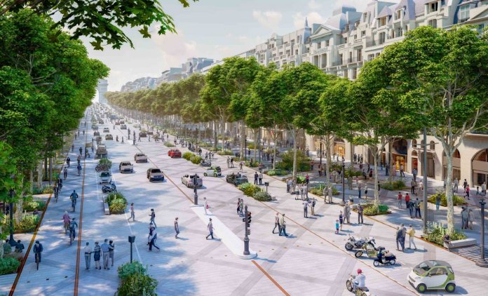 Un projet initié par des entreprises et soutenu par la municipalité parisienne prévoit la piétonnisation partielle – et l’inévitable végétalisation – des Champs-Élysées qui seront en outre parsemés d’obstacles cassant la perspective. Cette voie sacrée menant de la Concorde à la tombe du Soldat inconnu, trajet de défilés militaires et de manifestations populaires, sera défigurée.