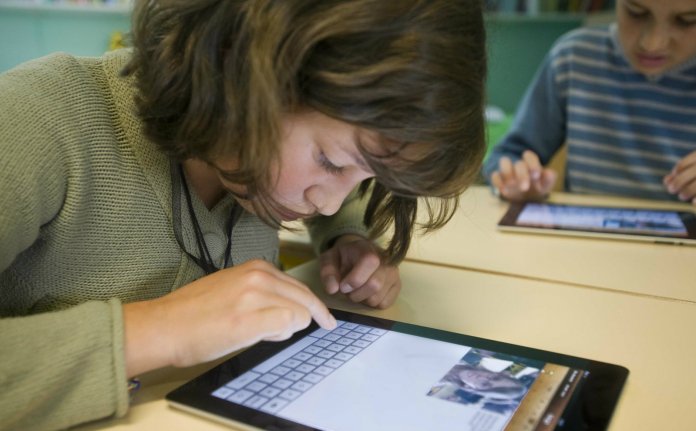 Une élève d'une école élémentaire d'Angers apprend à se servir d'une tablette numérique, juin 2011. SIPA. 00641827_000014