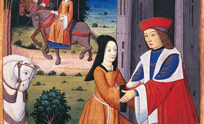Scène galante, miniature tirée d'"Yvain ou le chevalier au lion", Chrétien de Troyes, XIVe siècle
