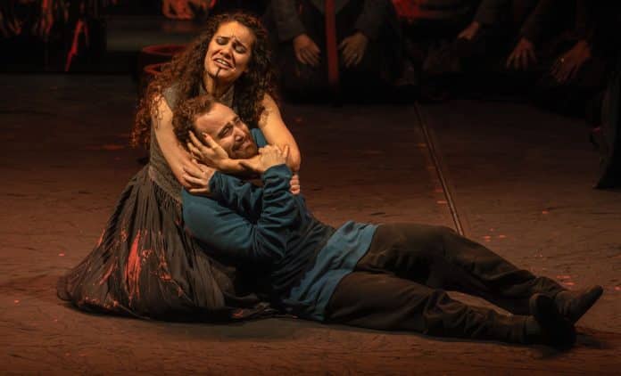 La saisissante beauté plastique de la scénographie, signée Emmanuel Clolus, se double de l’extraordinaire vitalité de la phalange Le Consort, ensemble parisien dédié depuis maintenant dix ans à la musique baroque. Au pupitre, le maestro Louis Langrée, à la tête de l’Opéra-Comique depuis bientôt cinq ans comme l’on sait, cèdera sa place à Théotime Langlois de Swarte pour les trois dernières représentations de cette production (les 8, 10 et 12 novembre prochains). Parions qu’à son tour le jeune chef insufflera à l’orchestre et au chœur le même souffle tour à tour sauvage et délicat, la même rutilance, la même intensité qui, d’un bout à l’autre, se retrouvait également, lors des premières représentations, dans le cast vocal de très haute tenue dont bénéficie le spectacle. A commencer par la soprano franco-algérienne Tamara Bounazou qu’on découvrait donc ici dans cette prise de rôle de la fille d’Agamemnon : articulation parfaite, superbe puissance de projection, brillance paroxystique d’une voix au métal qu’on voudrait parfois voir s’adoucir davantage dans l’onctuosité des passages pianissimo. Pour camper le matricide Oreste, le léger accent du baryton américain Theo Hoffmann ajoute au charme de son élégant vibrato (et à la séduction d’une performance de nu intégral dénouée de toute provocation), tandis que le ténor bien connu Philippe Talbot incarne Pylade avec un éclat juvénile singulièrement touchant. En Thoas, la basse -baryton imposante Jean-Fernand Setti appellera, au tomber de rideau, les ovations de la salle, unanime pour acclamer à juste titre l’impeccable réussite de ce spectacle.