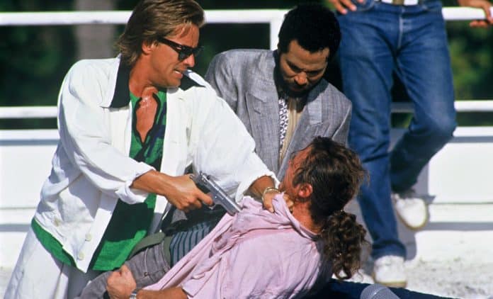 Chaque séquence de Deux Flics à Miami serait aujourd’hui examinée et condamnée sans procès sur l’autel d’un progressisme propret qui cache si mal son casernement mental. J’aimerais vous faire partager cet exhausteur d’existence qu’a représenté la série de 108 épisodes. De 1984 à 1989, deux flics enquêtaient sur les réseaux de la drogue et de la prostitution en lunettes Ray-Ban Wayfarer et en marcel pastel. Ils allaient au bureau en débardeur rose avec leur holster apparent. L’un avait la mèche mouvante, l’autre des frisottis nourris au Pento. Ils étaient souvent en sueur en raison d’une météo insupportable. Ça ne les empêchait pas de conduire décapoté. Dans leur univers, les filles enfilaient des maillots très échancrés comme sur les couvertures de Sports Illustrated. Avec eux, on pourchassait des voyous qui s’échappaient en Lamborghini Countach blanche. Il arrivait que l’on sorte son gun en plein restaurant devant un homard grillé. On roulait souvent la nuit sur des ponts déserts avec l’air que la vie ne sert à rien et que le mal est inhérent à la race humaine. On appelait un indic d’une cabine téléphonique. Des bastons éclataient dans des boîtes où des barons de la drogue ex-opposants castristes se comportaient mal.
