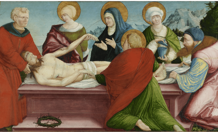 C’est une mise au tombeau tout en longueur : le tableau est la prédelle (partie basse) d’un retable. Le Christ, qui paraît moins mort que dolent, est couché sur un autel de pierre rose. Tous les personnages sont revêtus d’étoffes délicates, aux plis fluides, presque maniérés, aux tons acidulés, comme la manche moirée de Joseph d’Arimathie, à droite, qui alterne le jaune et le bleu. Les auréoles sont des disques parfaits qui se placent spontanément à l’arrière-plan des figures (saint Jean, de dos, n’est pas caché par son auréole) et tiennent à rester verticaux, sans se plier aux mouvements de leurs porteurs : la Vierge n’est pas centrée dans son auréole, qui est plus un écran accompagnant qu’un attribut solidement implanté sur la nuque. La Vierge, au visage et à l’auréole tout spécialement rayés par un iconoclaste (si les peintures germaniques sont rares, c’est qu’elles ont été très largement détruites par les protestants) : le restaurateur n’a pas voulu réparer l’outrage et les griffures un peu brunes, parallèles au corps du Christ, sont comme la trace du glaive de douleur que Syméon prophétisa à la Vierge.
