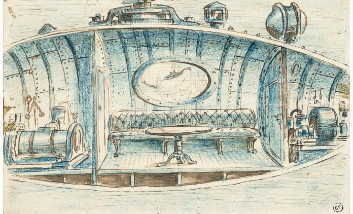 Associés à de nombreux extraits de films, l’exposition déploie un panorama d’affiches plus ou moins anciennes (Le cuirassé Potemkine, du grand Eisenstein), certaines désopilantes (Les Drames du pôle, par exemple, un film Gaumont de la grande époque). Dans une vitrine trône en majesté l’authentique robe en lamé or du célèbre muet de Jacques Feyder, L’Atlantide (1921). L’exposition se penche également sur les techniques de prises de vue – caissons, caméras sous-marines, jusqu’aux torpilles ou hélicoptères miniatures utilisées pour son documentaire Océans par le regretté Jacques Perrin, dont la dernière salle est dédiée à sa mémoire.