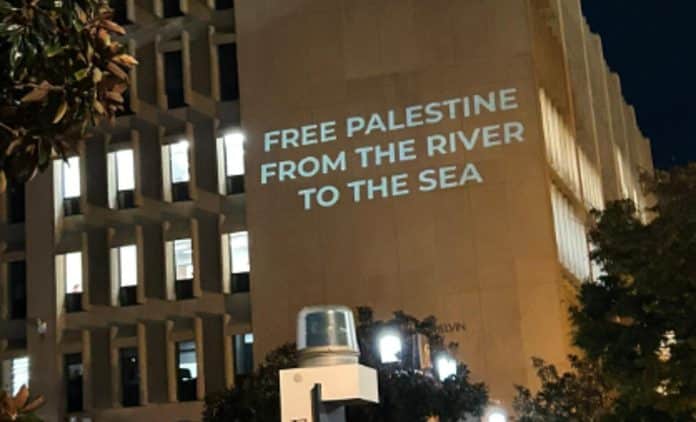 Le soir du 24 octobre, lors d’une manifestation à l’université George Washington, quatre étudiants masqués ont projeté sur les murs de la bibliothèque principale les slogans: « Gloire à nos martyrs », « GW [l’université George Washington] le sang des Palestiniens est sur vos mains », « Payer vos frais de scolarité, c’est financer le génocide à Gaza », et « Libérez la Palestine de la rivière à la mer », ce dernier étant le langage à peine codé pour la destruction de l’Etat d’Israël.