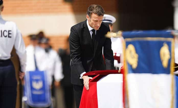 Emmanuel Macron assiste à l'hommage de trois policiers décédés dans un accident de voiture, à l'École nationale de police de Roubaix, dans le nord de la France, le jeudi 25 mai 2023. © Yoan Valat/SIPA