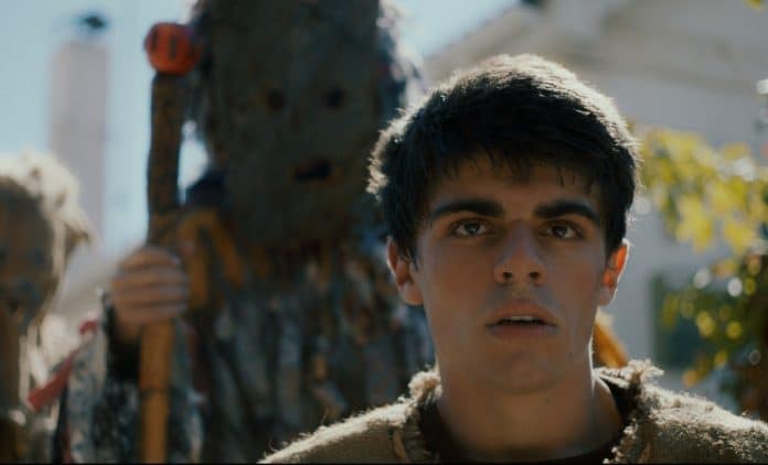 La scène du drame est un village du nord du Portugal. Traces s’ouvre sur un long prologue, dans un format d’écran réduit : au jour de la traditionnelle « fête du vent », bacchanale semi-païenne, les jeunes mâles costumés de plumes et cagoulés de toile de jute débondent leurs hormones dans une parade virile, porteuse de possibles exactions.