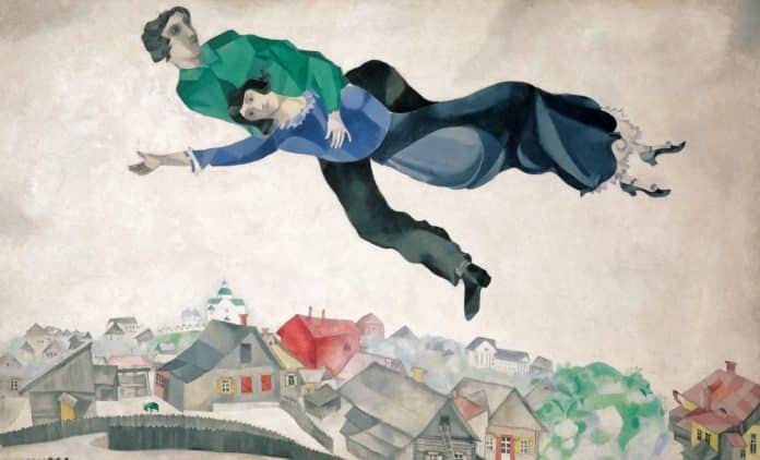 Au-dessus de la ville, tableau de Marc Chagall (1914-1918, galerie Tretiakov, à Moscou). (Détail) D.R.