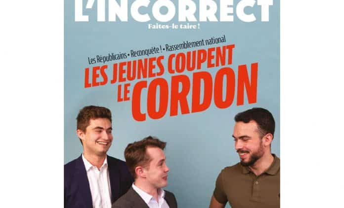 La une de L’Incorrect fait beaucoup jaser. Sous le titre « Les jeunes coupent le cordon », trois jeunes gens, visiblement copains, se marrent: Guilhem Carayon, Stanislas Rigault et Pierre-Romain Thionnet, respectivement responsables jeunes de LR, de « Reconquête ! » et du RN. Si l’entretien n’est pas encore disponible en ligne, le message est clair: chez les jeunes, l’union des droites a déjà eu lieu ! Cette jeunesse décomplexée se parle, se côtoie, festoie ensemble sans se soucier des frontières partisanes et des haines recuites de ses chefs. « J’espère que nous combattrons ensemble », déclare notamment Thionnet.