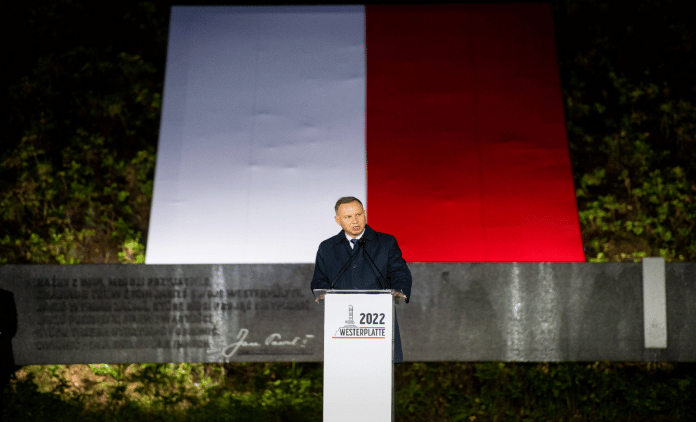 Le président polonais, Andrzej Duda, s'adresse à la foule lors du 83e anniversaire du début de la guerre de 1939-1945, à Westerplatte, 1/9/22 SOPA Images/SIPA 01086151_000025