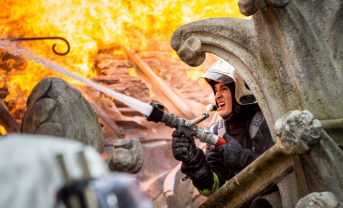Finalement alertés par des signalements téléphoniques, les pompiers de Paris partent en mission. Ils deviennent alors les principaux protagonistes du film, luttant pour sauver Notre-Dame des flammes pendant plusieurs heures, parfois malgré elle, tant sa structure et l’exigüité de certains accès gênent leur progression. On se prend à enrager contre tous les éléments qui ralentissent leur avancée: embouteillages et foules compactes, gouttes de plomb fondu trouant les lances anti-incendie, méconnaissance du vocabulaire spécialisé et du lieu qui ralentit leur recherche des saintes reliques, absence du régisseur qui a accès à des clés utiles, etc. Lucide, le général Gallet comprend rapidement que l’incendie va avoir des répercussions politiques : « Ça va débarquer de partout : les officiels, les politiques, les célébrités. On va avoir deux feux à gérer ».