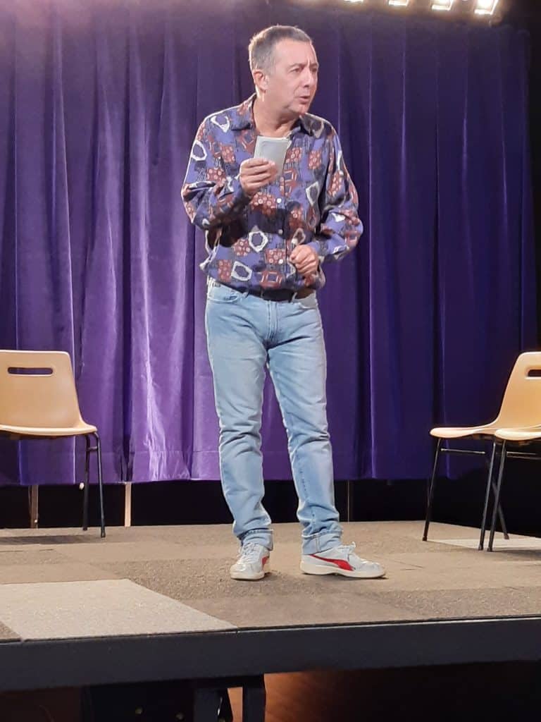 À la porte de la Maison du théâtre, nous rencontrâmes, mon ami Monsieur Freytel (c’est ainsi que le surnomme le fils de la Sauvageonne, car c’est l’enseignant du lycée fort respectable et catholique qu’il fréquente). Je ne t’ai pas encore précisé, lectrice adulée, que Christophe Freytel est aussi professeur de théâtre, metteur en scène (il a donné vie sur les planches à ma pièce sobrement intitulée Pourriture!) et l’un de mes meilleurs amis. « Si vous voulez assister au spectacle, dites-le-moi car il me reste des places ; j’accompagne un groupe d’élèves », nous dit-il, pétillant de bonheur et toujours ravi de faire plaisir. Nous acceptâmes de bonne grâce, et ne le regrettâmes point. Nous passâmes une heure et vingt minutes très agréables grâce à Une vie d’acteur et à la prestation solitaire de Pierre Maillet.