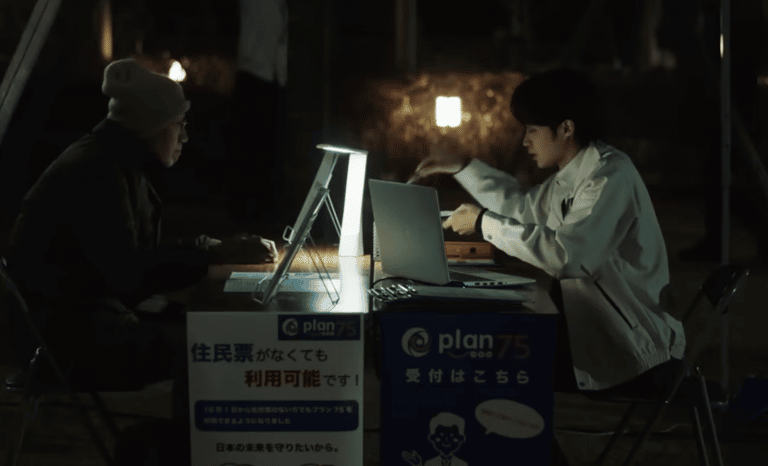Il ne fait pas beaucoup de bruit. On n’aime pas beaucoup parler de ces choses-là quand on n’a pas des raisons impérieuses et personnelles de le faire ou qu’on ne nous demande pas formellement notre avis. Loin de Soleil vert (1973) où la suppression des vieillards était la solution à la surpopulation mondiale et à la faim dans le monde, Plan 75 est une réponse réaliste, modeste, presque discrète. La proposition gouvernementale de l’euthanasie volontaire des gens de 75 ans est doublement rationnelle : répondre à la dérive exorbitante des coûts liés à la maladie et au vieillissement, répondre à la solitude des anciens, leur perte du lien social, leur sentiment d’inutilité : presque un win-win.