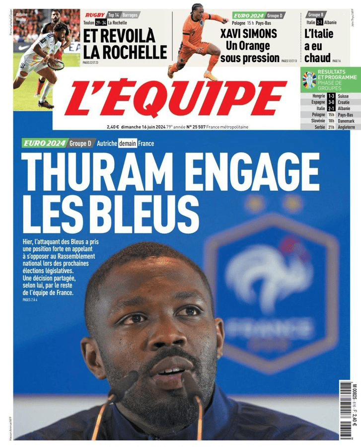 À l’heure de l’Euro 2024 et des prochaines élections législatives, le citoyen Marcus Thuram a appelé en conférence de presse, le samedi 15 juin, « à se battre pour que le Rassemblement national ne passe pas », faisant illico la très complaisante Une dominicale du journal L’Équipe, qui s’est étrangement mué en fanzine woke de la France insoumise ces dernières années. « J’ai zéro doute sur le fait que tout le monde (en équipe de France) pense comme moi », tient à préciser le fils du penseur racialiste et accessoirement ex-footballeur Lilian Thuram (lequel développe l’idée que les blancs sont structurellement « racistes sans le savoir » dans son livre La pensée blanche, paru en 2020, et a été accusé rappelons-le de violence conjugale par son ex-compagne Karine Le Marchand). Une précision inquiétante quand on connaît le CV de nombreux joueurs de l’équipe de France, Marcus Thuram inclus.