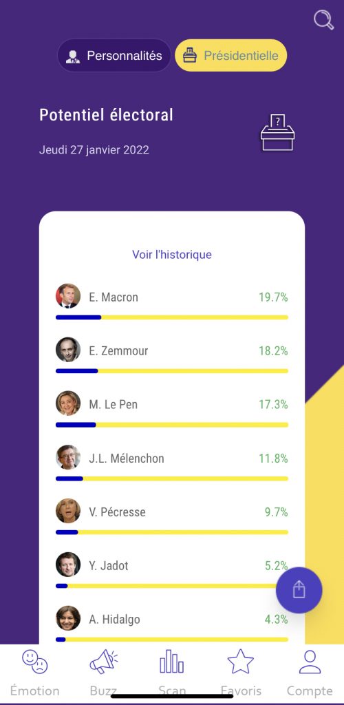 C’est une question fondamentale, au cœur de notre méthodologie. Nous sommes des capteurs d’émotions dans le sens où nous récoltons, catégorisons, et codons, notamment, des valeurs et des contre-valeurs qui sont au cœur des perceptions ou sensibilités des groupes et des individus. Ces valeurs, critères du désirable et du haïssable propres à une société donnée à un moment donné, sont porteuses de sens et d’émotions. Aujourd’hui, par exemple, le débat et les contenus que nous récoltons se structurent massivement autour de deux valeurs : la Fidélité et la Traitrise. Ce sont deux valeurs fondamentales porteuses d’adhésion ou de rejet qui vont peser sur les intentions de vote, voire sur le vote lui-même. Un adhérent LR de tendance ciotiste va se poser la question de sa fidélité au parti et, éventuellement, de la possibilité qu’il vote pour Zemmour. Idem pour un adhérent RN vis-à-vis de Zemmour qui rebat les cartes du paysage politique français. Capter les valeurs et donc les émotions des électeurs et des citoyens nous permet de cerner les convictions et dissonances cognitives de chacun, elles vont faire l’élection.